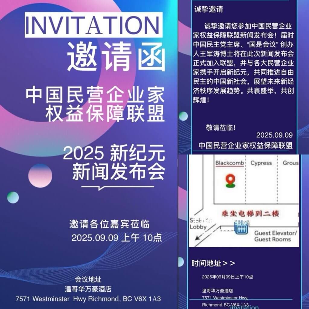 诚挚邀请您参加中国民营企业家权益保障联盟“2025新纪元”新闻发布会!届时,中国民主党主席、“国是会议”创办人王军涛博士将在此次发布会正式加入联盟,并与各大民营企业家携手开启新纪元,共同推进自由民主的中国新社会,展望未来新经济秩序的发展趋势,共襄盛举,共创辉煌!